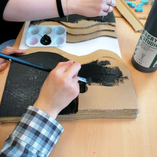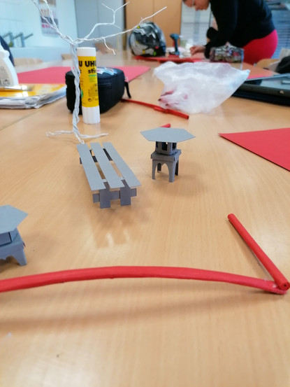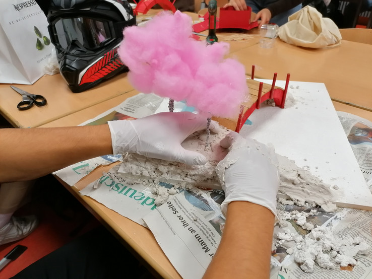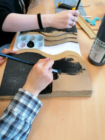 "Wir haben zunächst die Knete zu einer dünnen Fläche gedrückt, damit wir die passende Größe mit einem Cuttermesser ausschneiden und an die Kanten der Bodenplatte befestigen konnten. Am Ende haben wir die Knete mit schwarzer Farbe übermalt, um die Oberfläche einheitlich zu gestalten." Nina N.