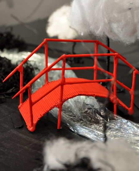 • abstrahierte Landschaft mit einer oder mehreren roten Rundbrücken (je nachdem, ob in Einzel- oder Gruppenarbeit konzipiert) -> roter Faden des Projekts