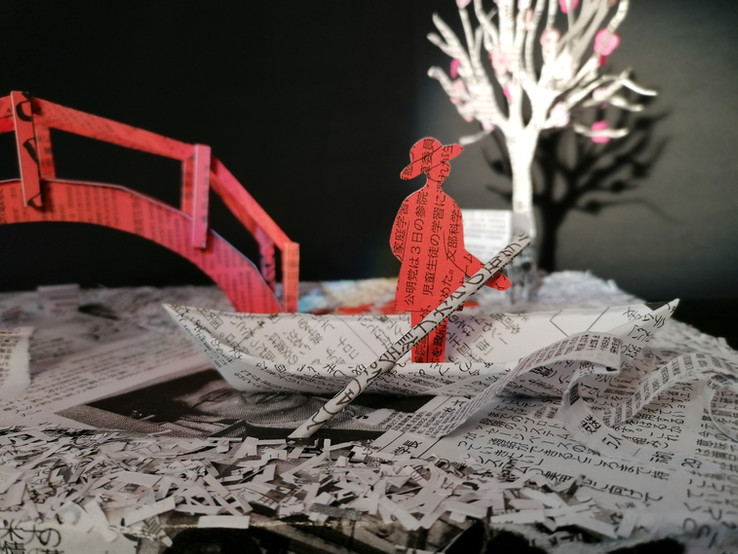 "Ich habe im Internet nach echten japanischen Zeitungsauschnitten gesucht (Sucheingabe: jpn „日刊新聞“, „Tageszeitung“), diese dann doppelseitig auf verschieden starkes Papier gedruckt, damit auf beiden Seiten überall die japanischen Schriftzeichen zu sehen sind, die Self Made Zeitung dann passend zugeschnitten und für meine Brückenlandschaft benutzt." Klara K.