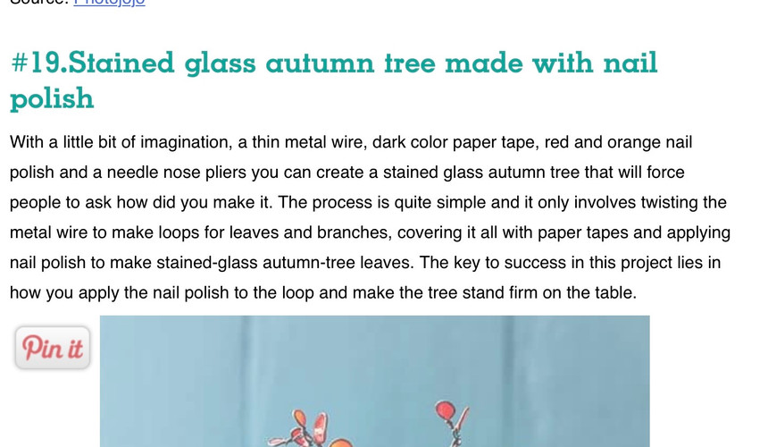 Self Made Tiffany: "Zuerst habe ich aus einem dünnen Metalldraht mehrere kleine Schlaufen geformt und daraus Äste gebaut. Diese Äste habe ich anschließend zu einem Baum verbunden. Zur Vorbereitung habe ich mir verschiedene, herbstliche Nagellacktöne besorgt, die ich zur Färbung der Schlaufen auf eine Klarsichtfolie getropft habe, sodass eine Art „Nagellackpfütze“ entstand. In dieser habe ich dann die einzelnen Schlaufen gelegt, bis sich der Nagellack innerhalb der Schlaufen verteilt hat. So entstand der glasige Effekt der Blätter." Yasmin K.