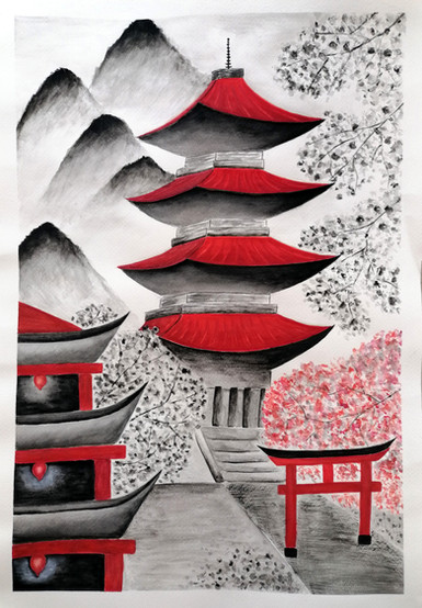"Ich habe mit Wasserfarben gearbeitet, doch als mir Schwarz ausging, musste ich zur schwarzen Aquarellfarbe aus der Tube greifen, wobei mir aufgefallen ist, dass sie sich schwieriger einarbeiten und verblenden lässt als die Wasserfarbe und man dadurch keine flüssigen Übergänge erzeugen konnte, wie man beispielsweise an der Berglandschaft im Hintergrund erkennen kann." (Marie Ch.)